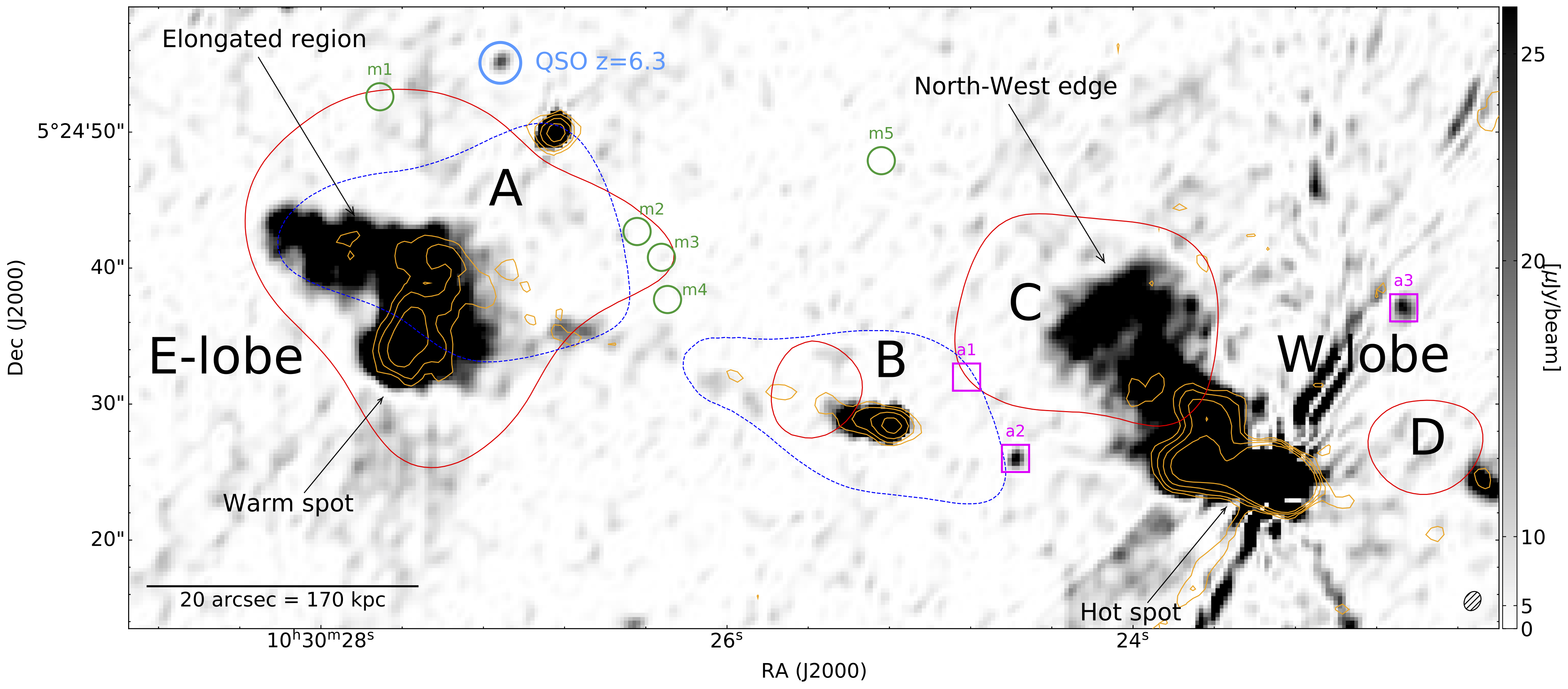 JVLA image of the z=1.69 FRII and associated protocluster region. Orange contours refer to the past VLA observations at 1.4 GHz. Blue and red contours show hard and soft X-ray diffuse emission, respectively: the main spots are as labeled (A, B C and D). The positions of protocluster members discovered by MUSE and ALMA are indicated as green circles and magenta boxes, respectively (D'Amato et al. 2022).